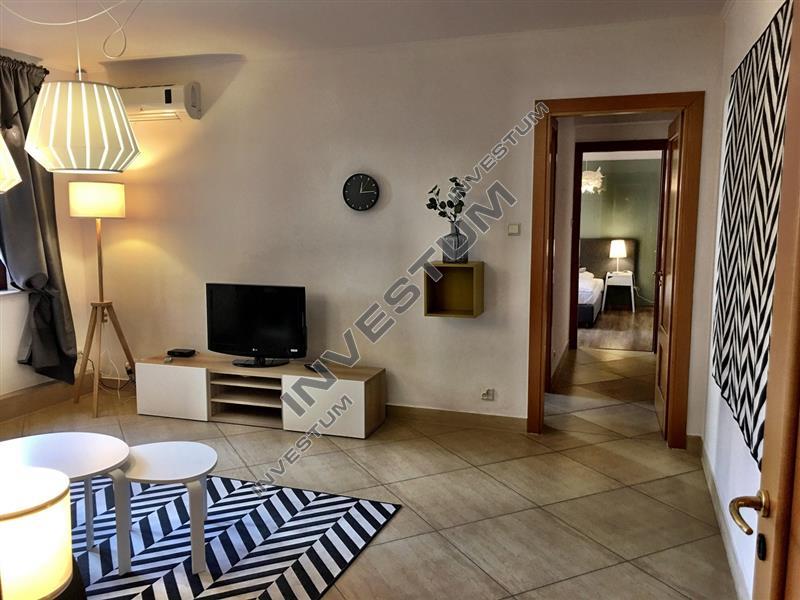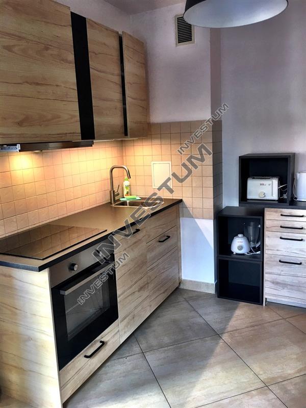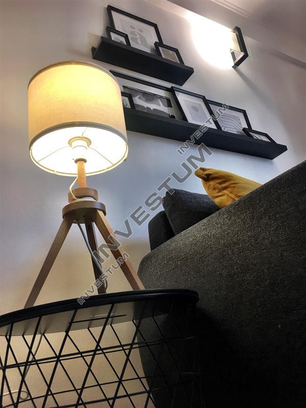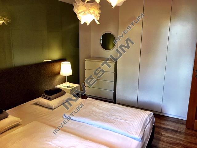 Sypialnia z wyjsciem na balkon, posiada podwójne łoże, funkcjonalną szafę, małe biurko i dodatki. Kuchnia z jadalnią i z wyjściem na balkon - z meblami na wymiar i sprzętem AGD (w tym: lodówka, zmywarka, piekarnik, płyta). W pokoju dziennym sofa, fotel, szafka rtv + telewizor, oświetlenie i dodatki. Łazienka z wanną i pralką.