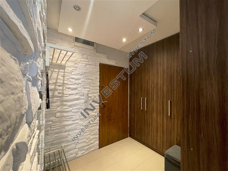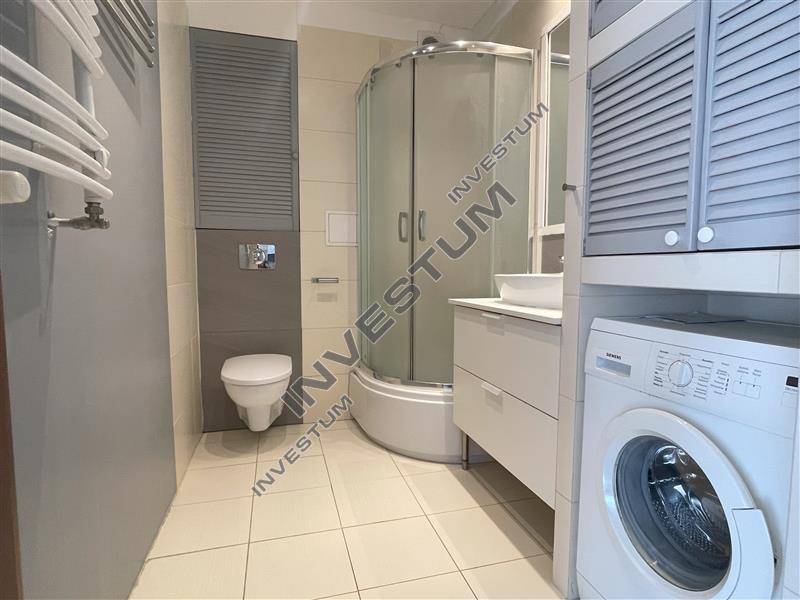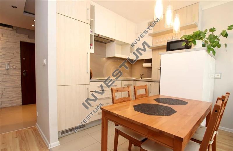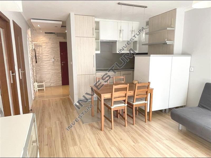 Umeblowanie: w części dziennej sofa z funkcją spania, meble pokojowe; w aneksie kuchennym meble i AGD (piekarnik, płyta grzewcza, lodówka, zmywarka i okap), stół i krzesła, w sypialni podwójne łóżko z materacem, komoda, szafka wisząca. Łazienka z prysznicem i pralką. W holu duża, pojemna zabudowa szaf, wieszak, miejsce na buty.